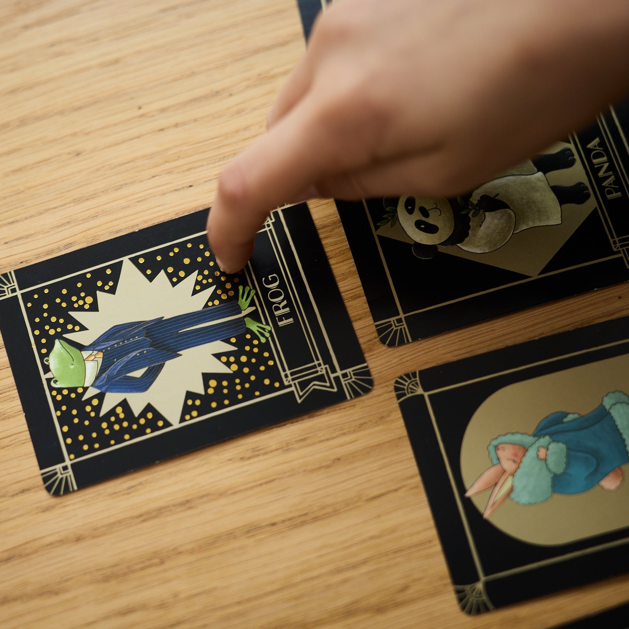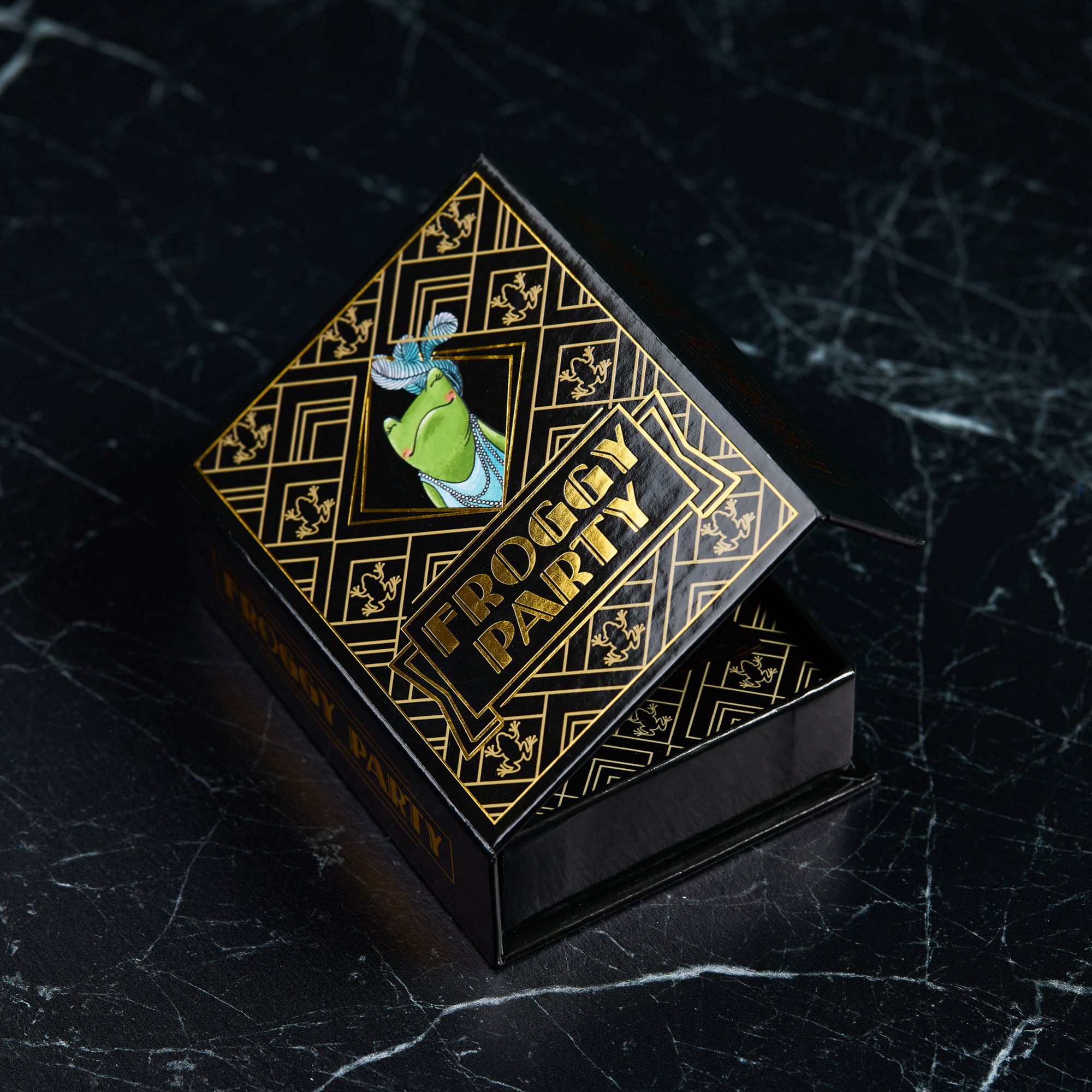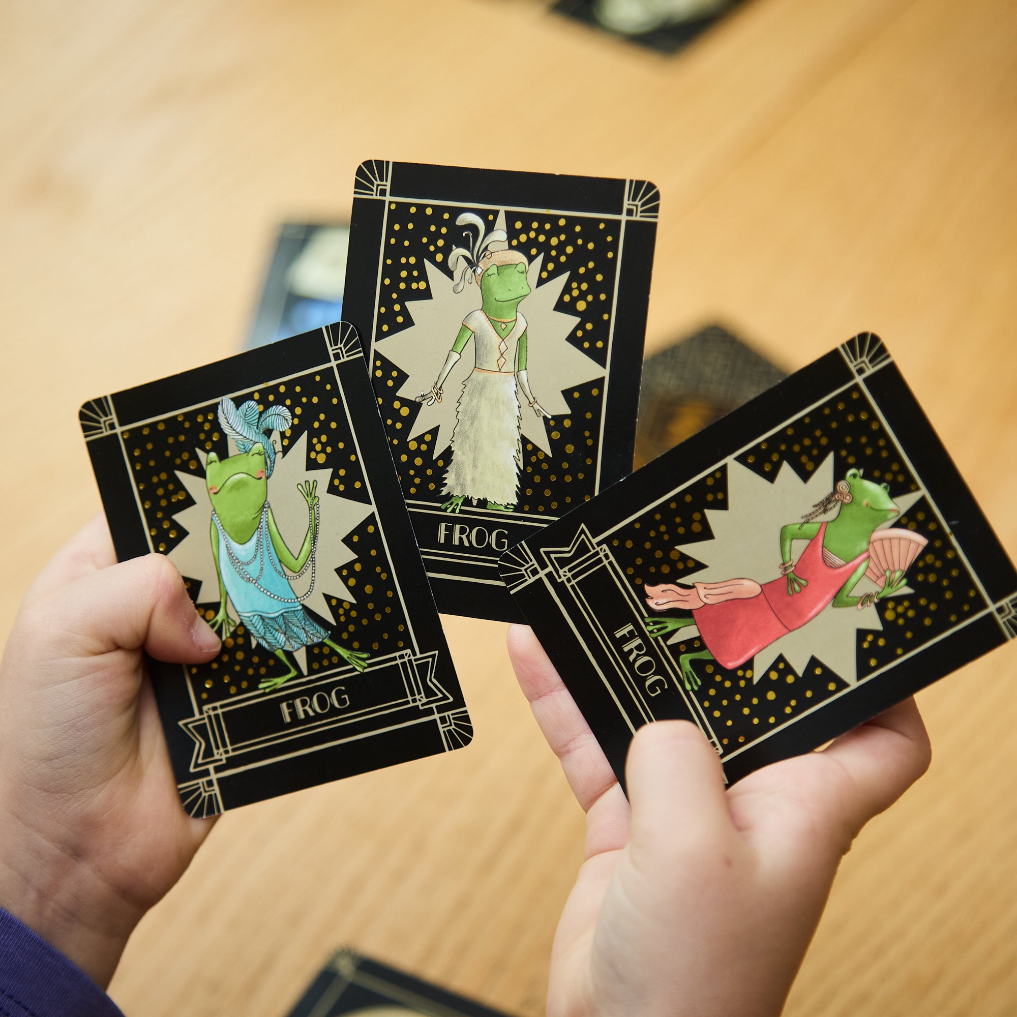 Players take turns drawing cards and creating their own glittering gala of beautifully illustrated animals. Snag three fabulous frogs and you’ll claim victory—but beware! Behind every feathered hat and velvet waistcoat lurk twists, turns, and delightful upsets that could shut down your party for good!